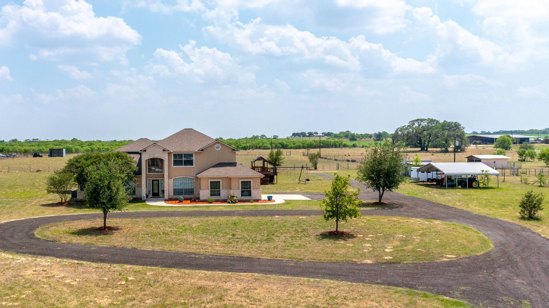 This expansive estate embodies the Texas spirit as you relax on the covered porch taking in the evening sun with scenic views of mature centuries old oak trees, pastures, and livestock. On over 22 AG exempt acres, this custom built 3233 sq ft 5 bedroom & 2.5 bath move-in ready home provides the perfect scene for entertaining in the open floor plan kitchen/dining/living room. Vaulted ceilings in the living room and entry way provide ample natural light with plantation shutters located throughout the home. The skillfully designed main floor master suite guarantees the ideal retreat. The alternative main floor bedroom works well as a study, office, or guest/mother in law suite with a private entry and patio. Enjoy the peace of the countryside with all the amenities of the city with a short 34 minute drive to downtown San Antonio!