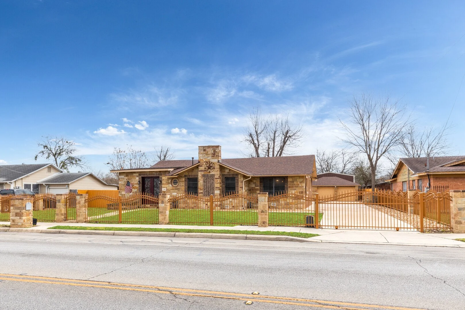 6 miles of Lackland AFB and within a couple of miles of nearby schools. Only 7 miles to downtown San Antonio! This gorgeous home sits on a full acre with mature pecan trees and a covered outdoor living space with an accessible outdoor half bath perfect for entertaining! The two car garage and added 30x50 metal workshop/building provides extra space for a home gym, game room, workshop, or a collection of cars. The car lift bolted into the concrete foundation of the metal bldg will convey with property